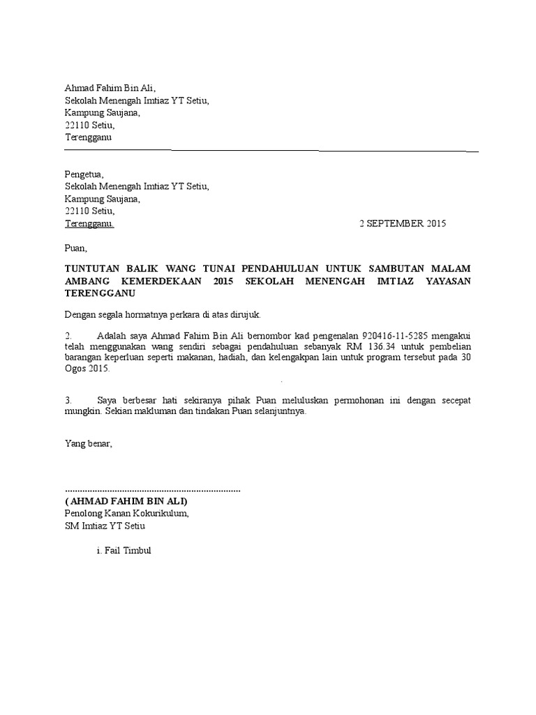 Contoh Surat Rasmi Memohon Wang Pendahuluan Wang Bilinuai